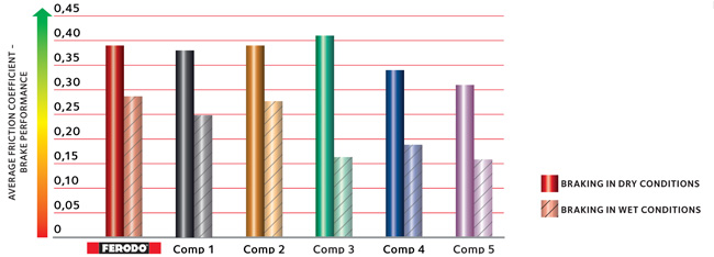 The graph above shows you the percentage of friction level reduction – or brake performance – between braking in dry and wet conditions, with Ferodo showing the lowest reduction from dry to wet compared to some competitors.